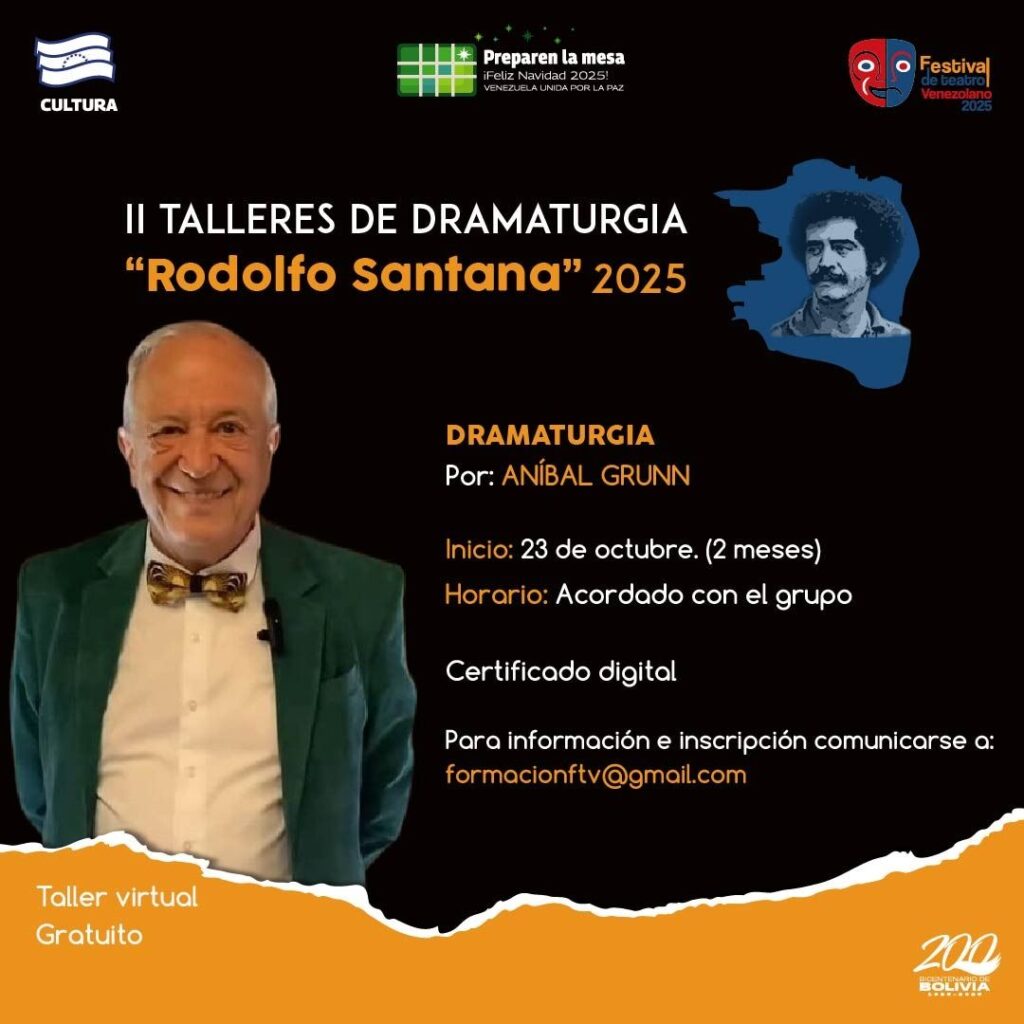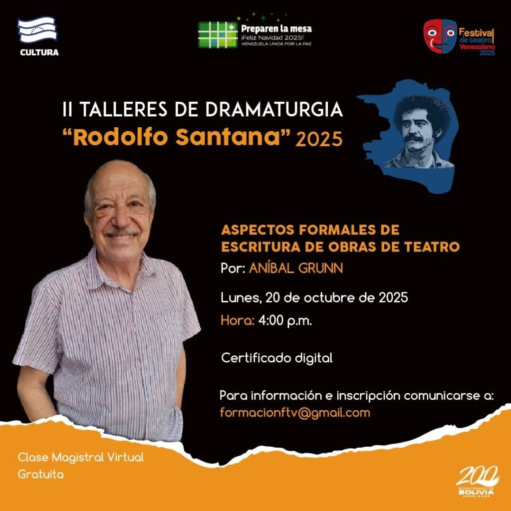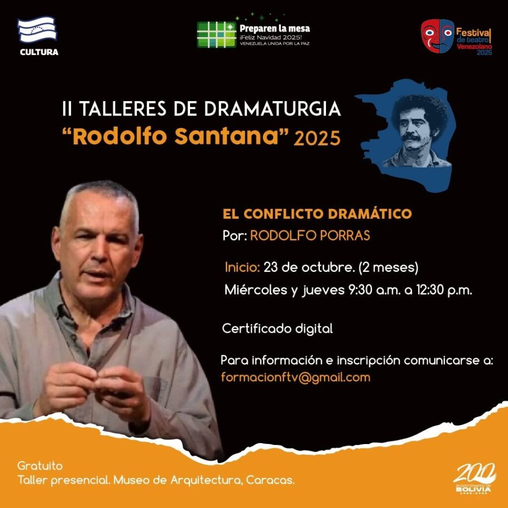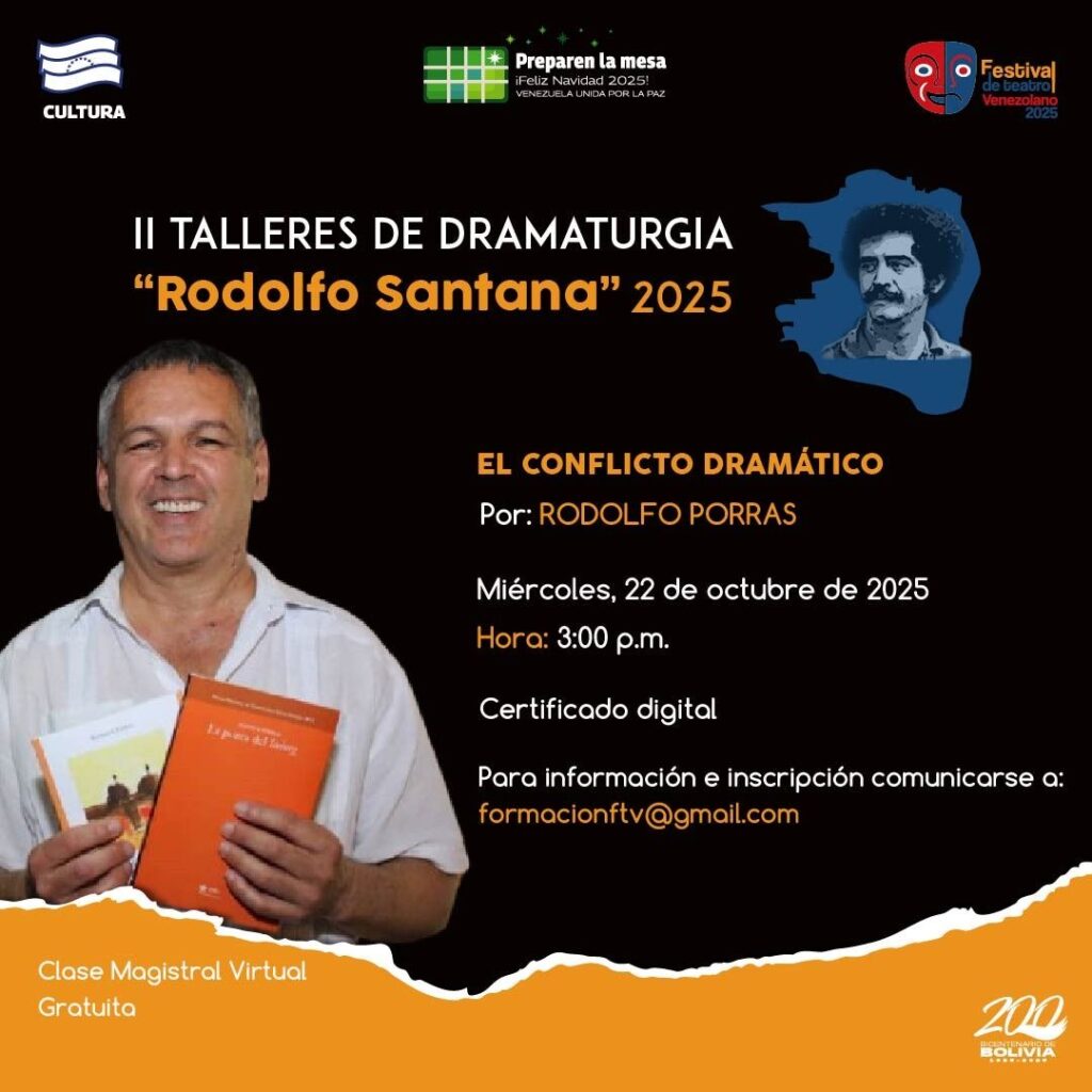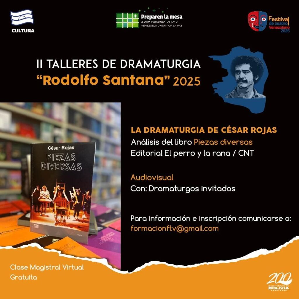 Prensa MPPC (14/10/2025). – En el marco del Festival de Teatro Venezolano, la Compañía Nacional de Teatro (CNT) y el Centro Nacional del Libro (Cenal) anuncian la convocatoria a la segunda edición de los Talleres de Dramaturgia “Rodolfo Santana” 2025.
