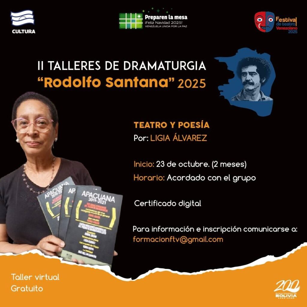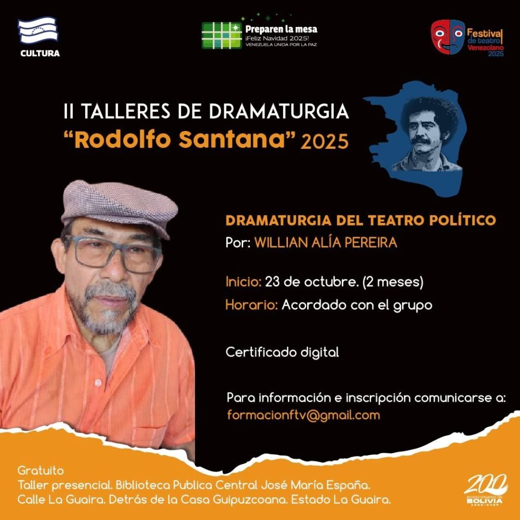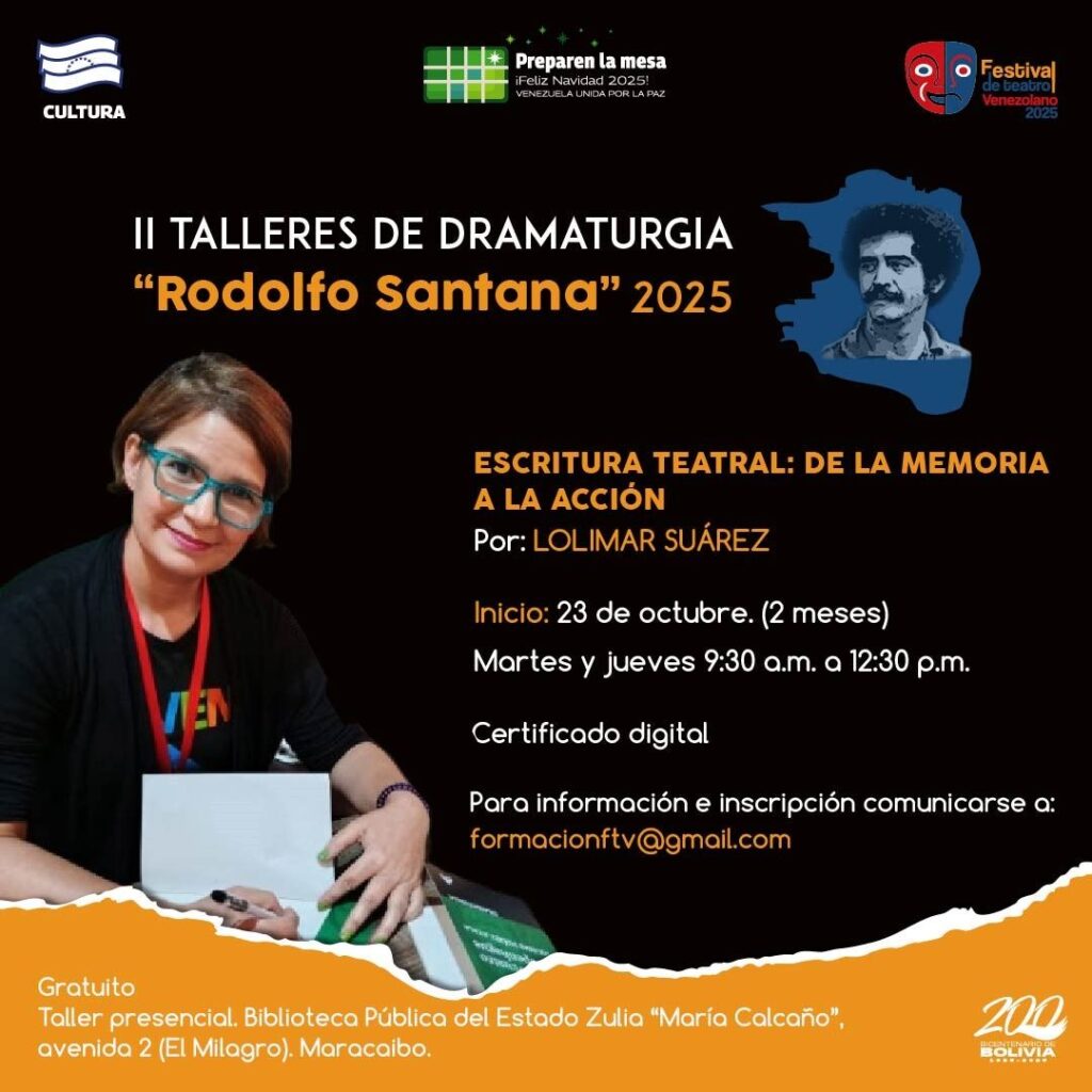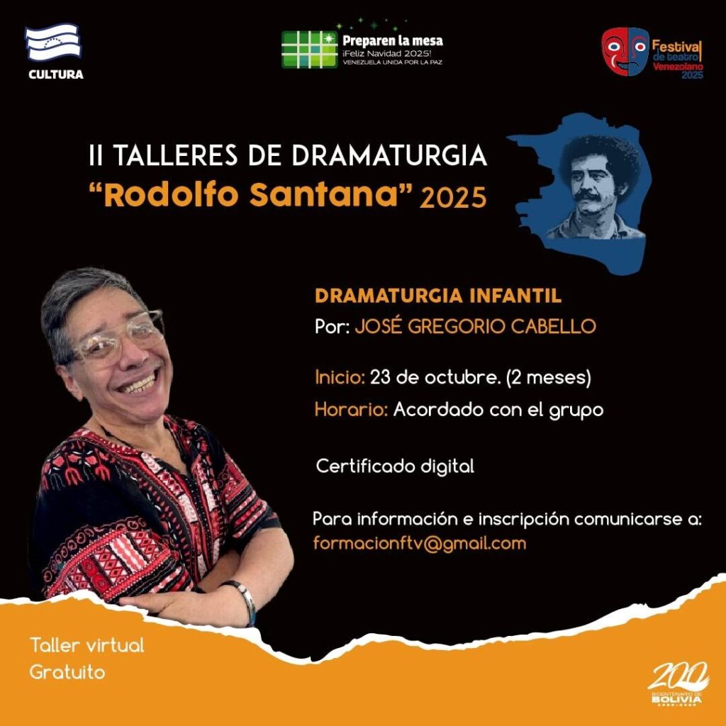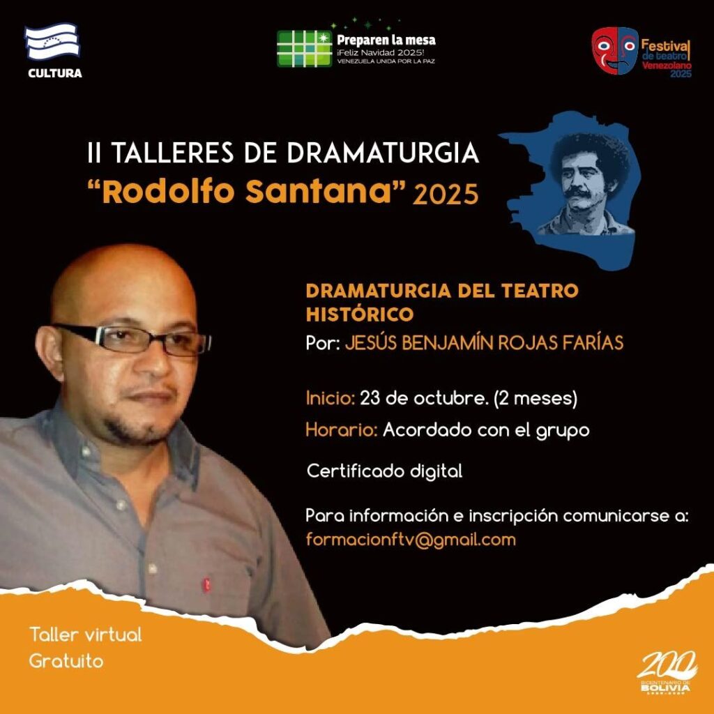 Prensa MPPC (14/10/2025). – En el marco del Festival de Teatro Venezolano, la Compañía Nacional de Teatro (CNT) y el Centro Nacional del Libro (Cenal) anuncian la convocatoria a la segunda edición de los Talleres de Dramaturgia “Rodolfo Santana” 2025.