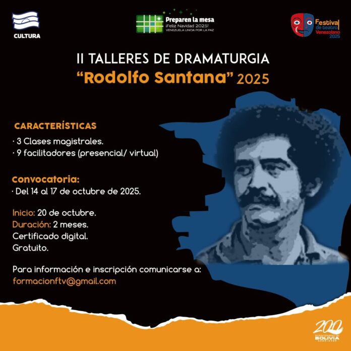 Prensa MPPC (14/10/2025). – En el marco del Festival de Teatro Venezolano, la Compañía Nacional de Teatro (CNT) y el Centro Nacional del Libro (Cenal) anuncian la convocatoria a la segunda edición de los Talleres de Dramaturgia “Rodolfo Santana” 2025.
