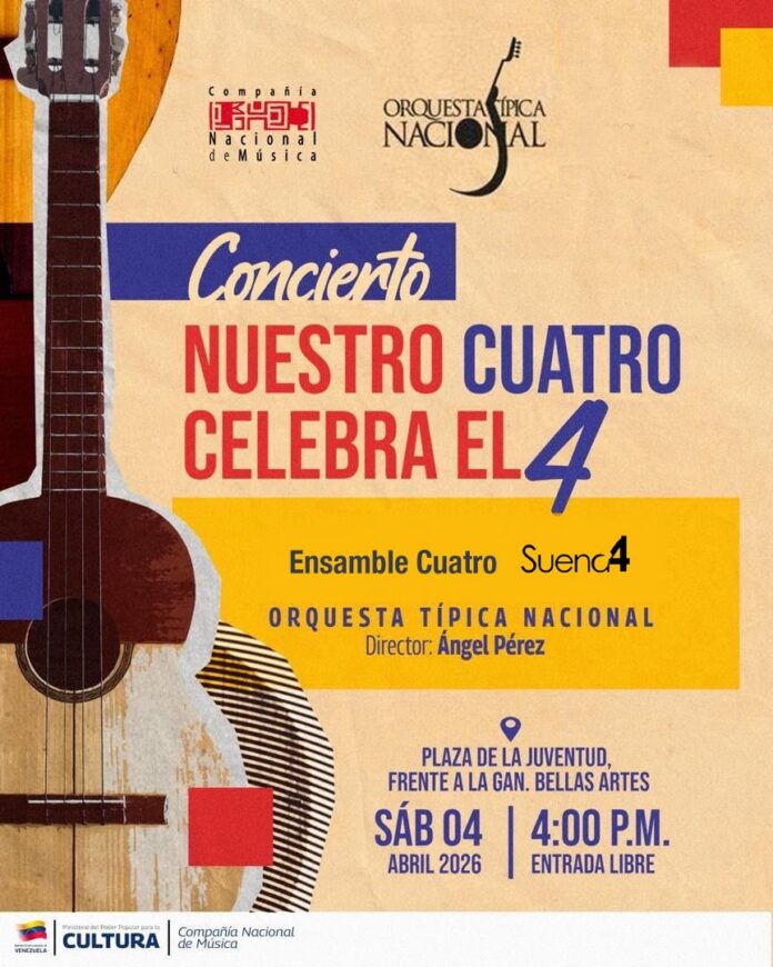 Prensa MPPC (03/04/26).- Este sábado 04 de abril, desde las 4 de la tarde sonará el cuatro venezolano en todo el país con motivo de su celebración anual, y el Ministerio del Poder Popular para la Cultura, a través de la Fundación Compañía Nacional de Música y la Misión Cultura, han preparado un encuentro que rinde homenaje a nuestro instrumento soberano.