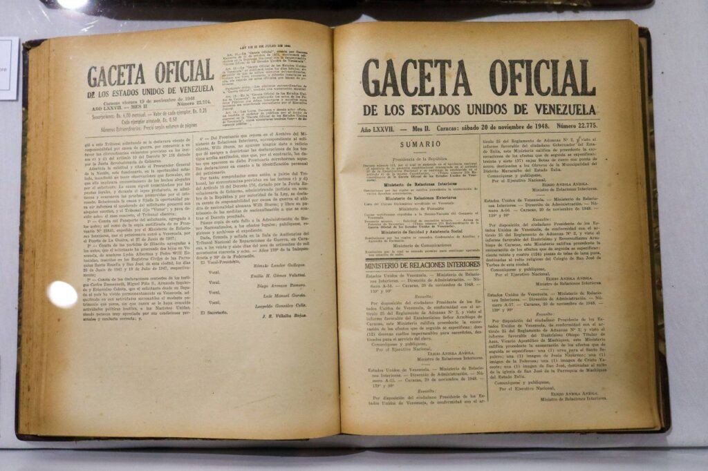 La curaduría de la exposición reunió colecciones del Celarg, el Archivo Histórico de Miraflores y la Biblioteca Nacional. La muestra incluye alrededor de 60 documentos, entre los que se encuentran gacetas oficiales y hemeroteca de la época (1947-1948), telegramas, la declaración jurada de Gallegos y la silla presidencial.
