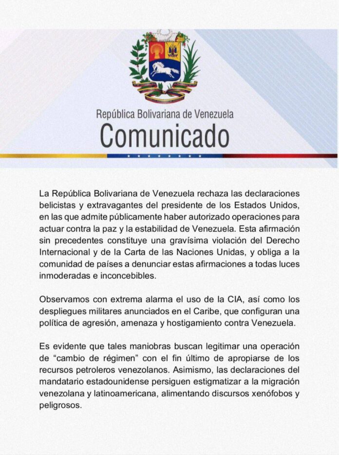 🟢 La República Bolivariana de Venezuela rechaza contundentemente las declaraciones belicistas y extravagantes del presidente de los Estados Unidos.