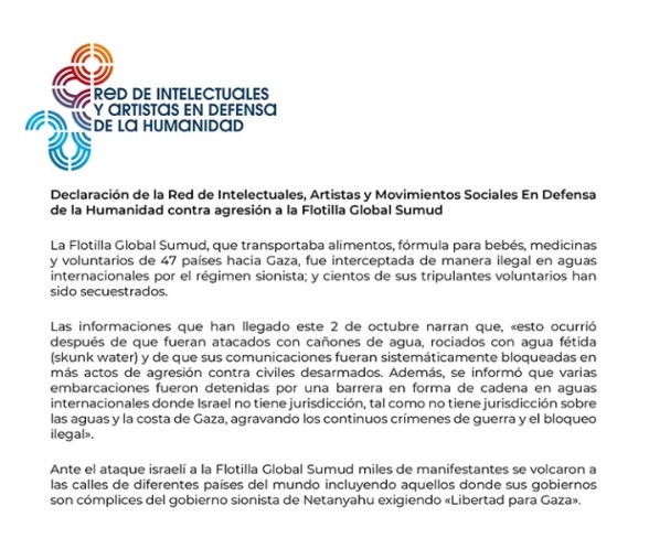La Red de Intelectuales, Artistas y Movimientos Sociales En Defensa de la Humanidad (REDH) hizo público un comunicado en el que condena y expresa su repulsión por el gobierno de Israel, tras la interceptación, de manera ilegal en aguas internacionales de la Flotilla Global Sumud.