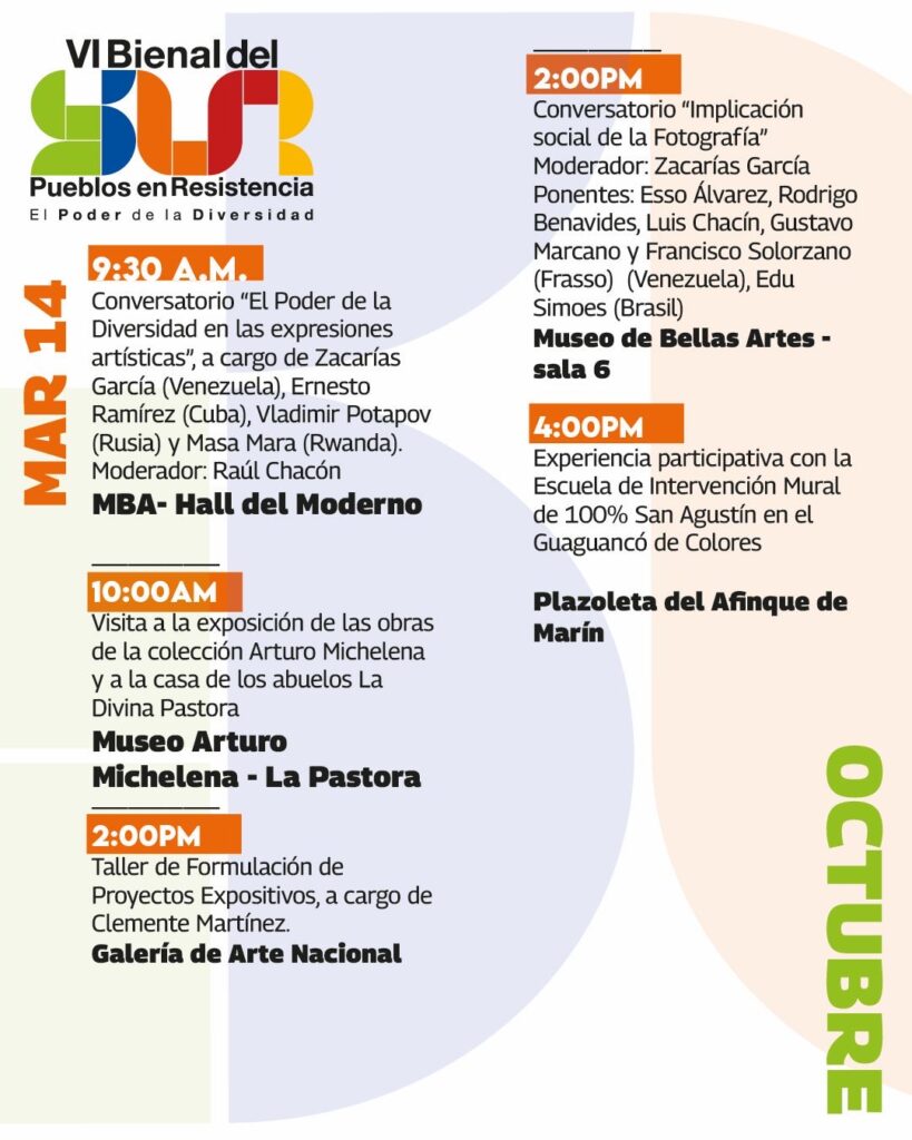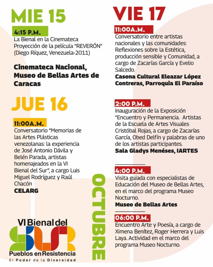 Las actividades de la VI Bienal del Sur demuestran su alcance extramuros, pues no se limitan a los recintos museísticos: varias parroquias de Caracas, como San Agustín, El Valle, Petare, San Juan y El Paraíso, acogerán talleres y conversatorios, además de jornadas de muralismo y cine-foros en San Agustín y El Valle, complementándose con visitas guiadas especiales en espacios clave como el Museo de Bellas Artes, el Museo Carlos Cruz-Diez y la Fundación Celarg.