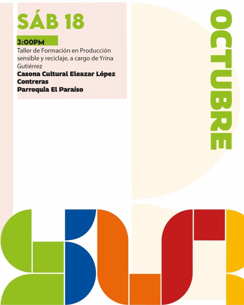 • 4:00 p. m. – Casona Cultural Eleazar López Contreras. Taller “Formación en Producción sensible y reciclaje”, a cargo de la artista plástico venezolana Yrina Gutiérrez.