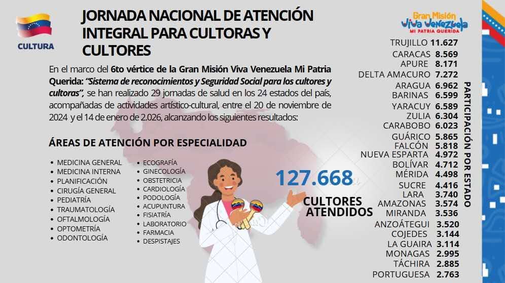 Prensa MPPC (16/01/2026). – En el marco del sexto vértice de la Gran Misión Viva Venezuela mi Patria Querida, “Sistema de Reconocimientos y Seguridad Social para los cultores y las cultoras” el Ministerio del Poder Popular para la Cultura (MPPC) ha realizado 29 jornadas nacionales de atención integral en los 24 estados del territorio nacional donde han sido beneficiados 127.668 artistas , creadores y creadoras, entre el 20 de noviembre de 2024 y el 14 de enero de 2026.