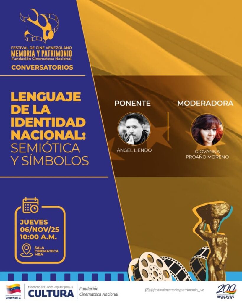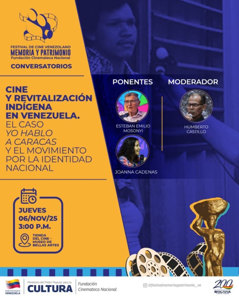 - Jueves 06 de noviembre: Doble jornada de reflexión. Por la mañana, “Lenguaje de la Identidad Nacional: Semiótica y Símbolos” con Ángel Liendo. Por la tarde (3:00 p.m. en la Tienda del Cine), se realizará el conversatorio “Cine y Revitalización Indígena en Venezuela” con Esteban Emilio Mosonyi y Joanna Cadenas.