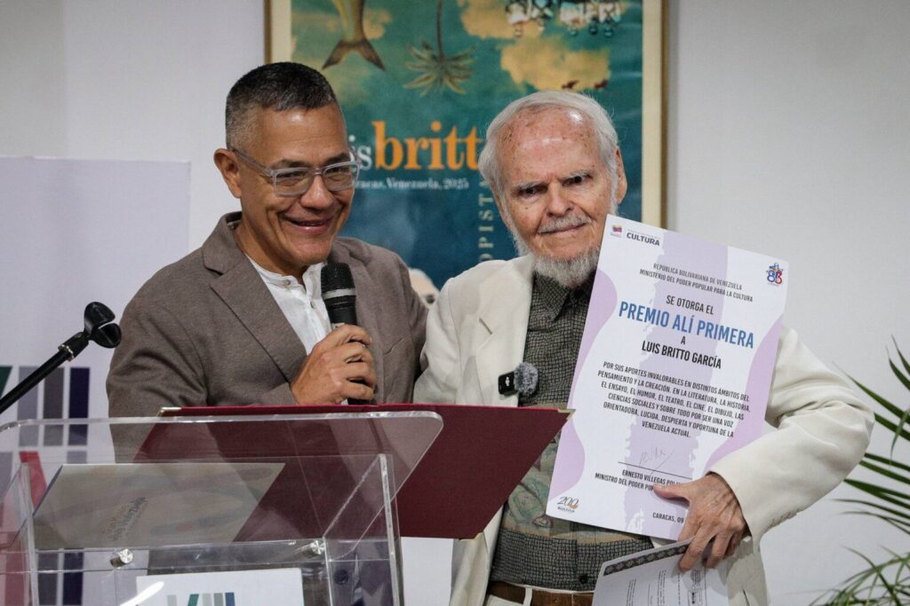 Prensa MPPC (09/10/2025).- Este jueves 09 de octubre, el reconocido escritor, abogado, poeta y pensador venezolano Luis Britto García fue galardonado con el Premio Alí Primera y con declarado Portador Patrimonial de la Nación, durante un emotivo homenaje realizado a propósito de su cumpleaños número 85.