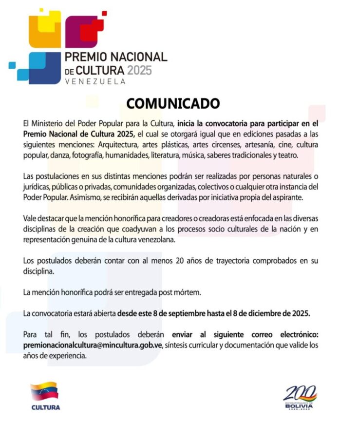 Prensa MPPC (30/11/2025).– El Ministerio del Poder Popular para la Cultura recuerda que continúa abierta la convocatoria para el Premio Nacional de Cultura 2025, dirigida a reconocer a creadores y creadoras cuyos aportes han enriquecido las diversas disciplinas artísticas y culturales del país.