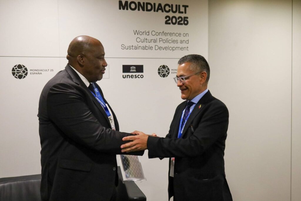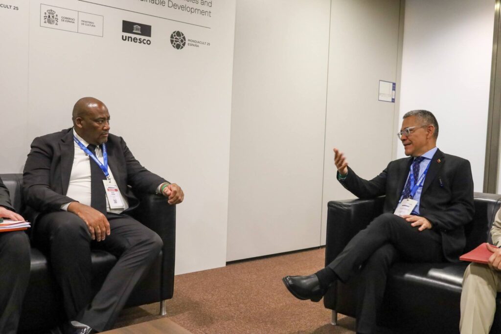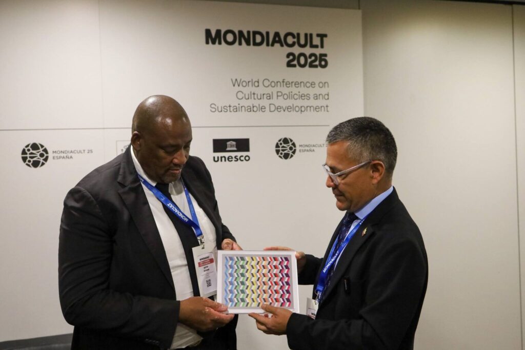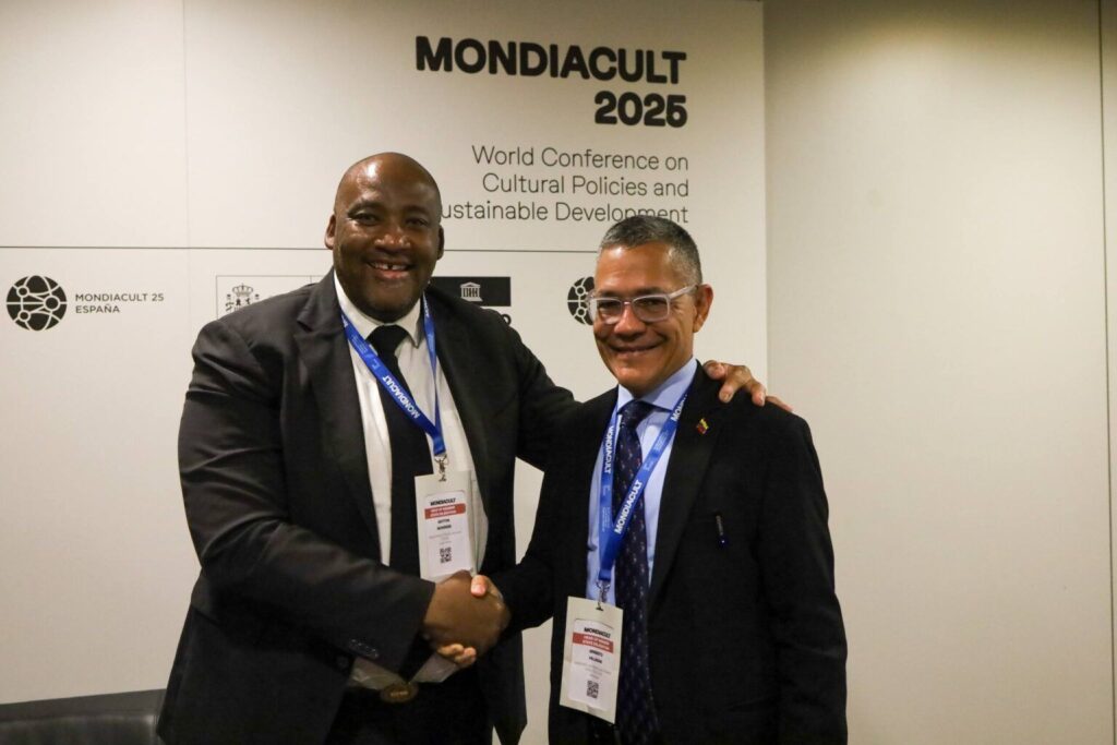 Prensa MPPC (29/09/2025).- Este lunes, el ministro del Poder Popular para la Cultura de Cultura de Venezuela, Ernesto Villegas, y su homólogo de Deportes, Artes y Cultura de Suráfrica, Gayton Makenzie, sostuvieron una significativa reunión, como parte de la Conferencia Mundial de Políticas Culturales de la Unesco (MONDIACULT) 2025) que se celebra en Barcelona, España.