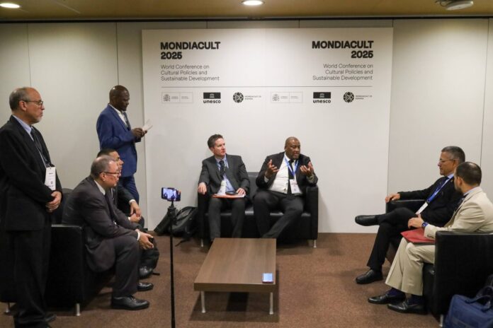 Prensa MPPC (29/09/2025).- Este lunes, el ministro del Poder Popular para la Cultura de Cultura de Venezuela, Ernesto Villegas, y su homólogo de Deportes, Artes y Cultura de Suráfrica, Gayton Makenzie, sostuvieron una significativa reunión, como parte de la Conferencia Mundial de Políticas Culturales de la Unesco (MONDIACULT) 2025) que se celebra en Barcelona, España.